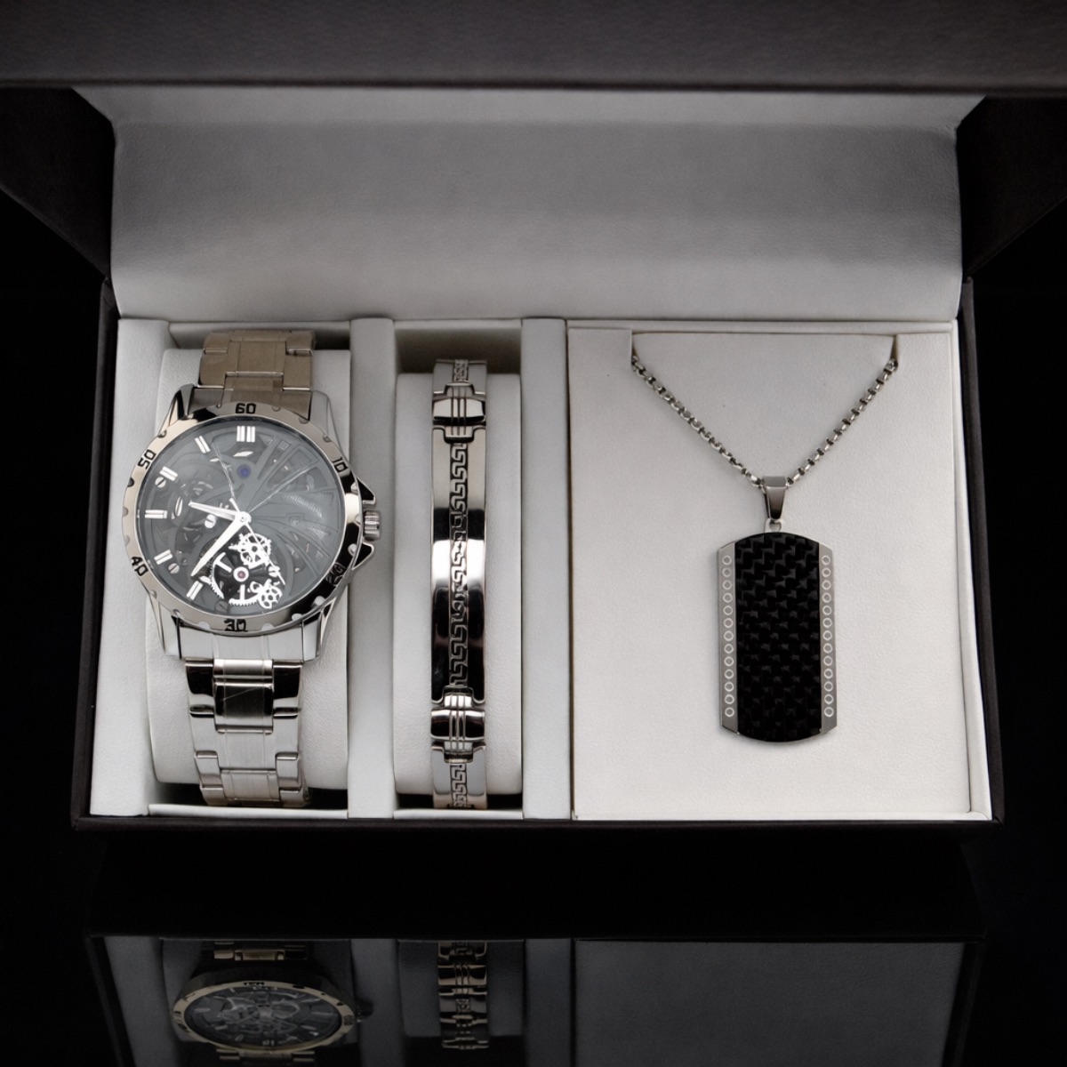 Σετ γυναικείο ρολόι – χειροπέδα -κολιέ -δαχτυλίδι-σκουλαρίκια σε δερμάτινη κασσετίνα δώρου