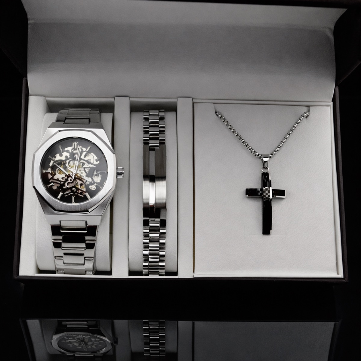 Σετ γυναικείο ρολόι – χειροπέδα -κολιέ -δαχτυλίδι-σκουλαρίκια σε δερμάτινη κασσετίνα δώρου